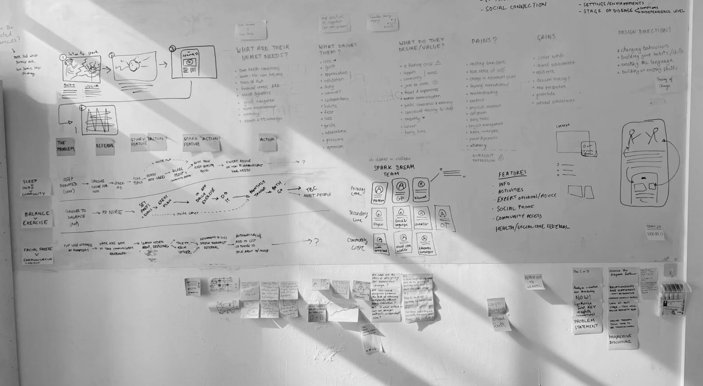 While there are apps that help track symptoms with a clinical focus on the PwP, Spark focus on the couple's journey and guides them through their search to learn more about their diagnosis and quest for physical therapy. The mechanism we propose is to deliver emotional wellbeing benefits by leveraging physical and social wellbeing.